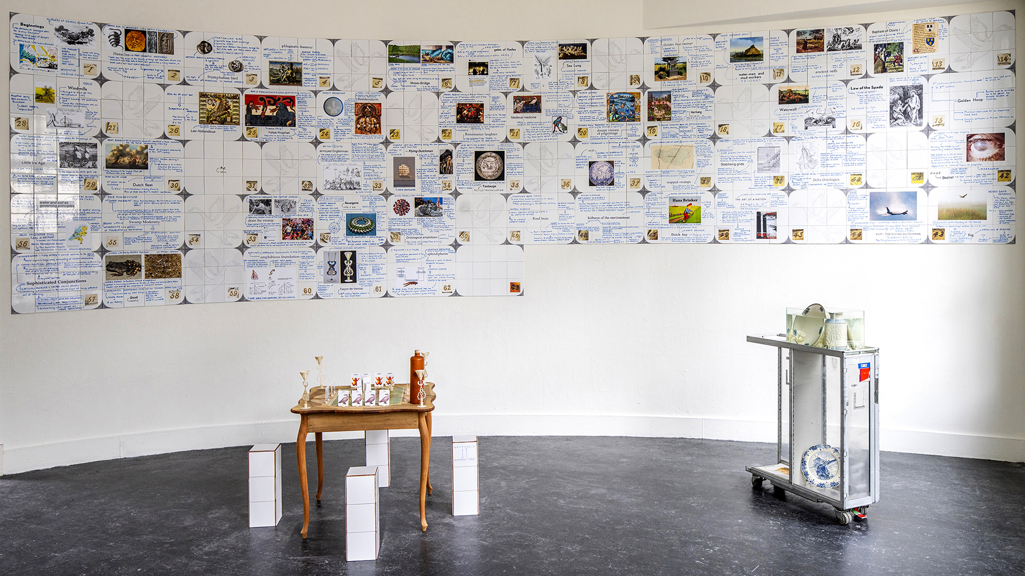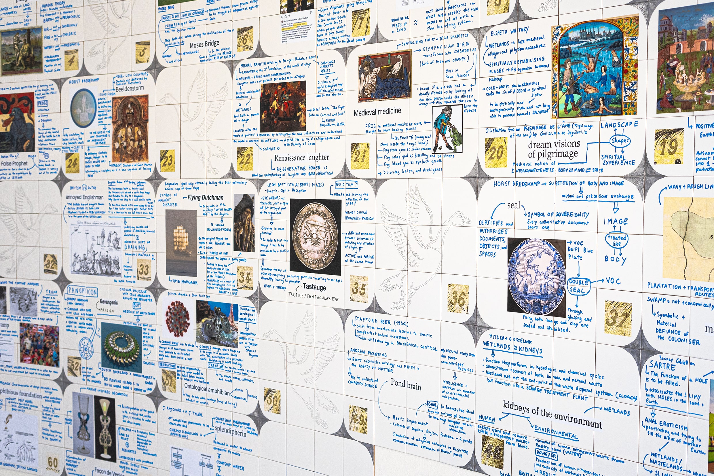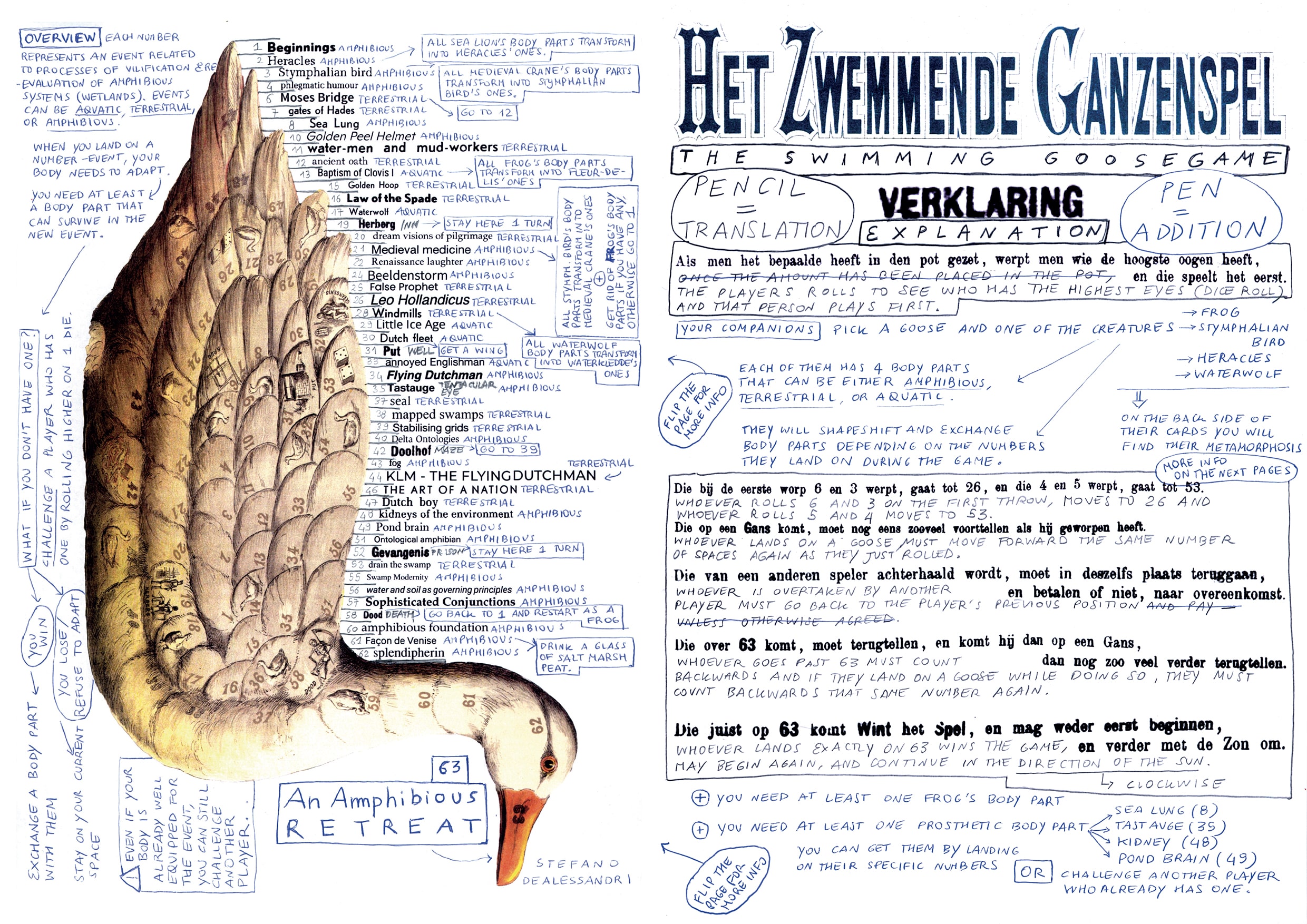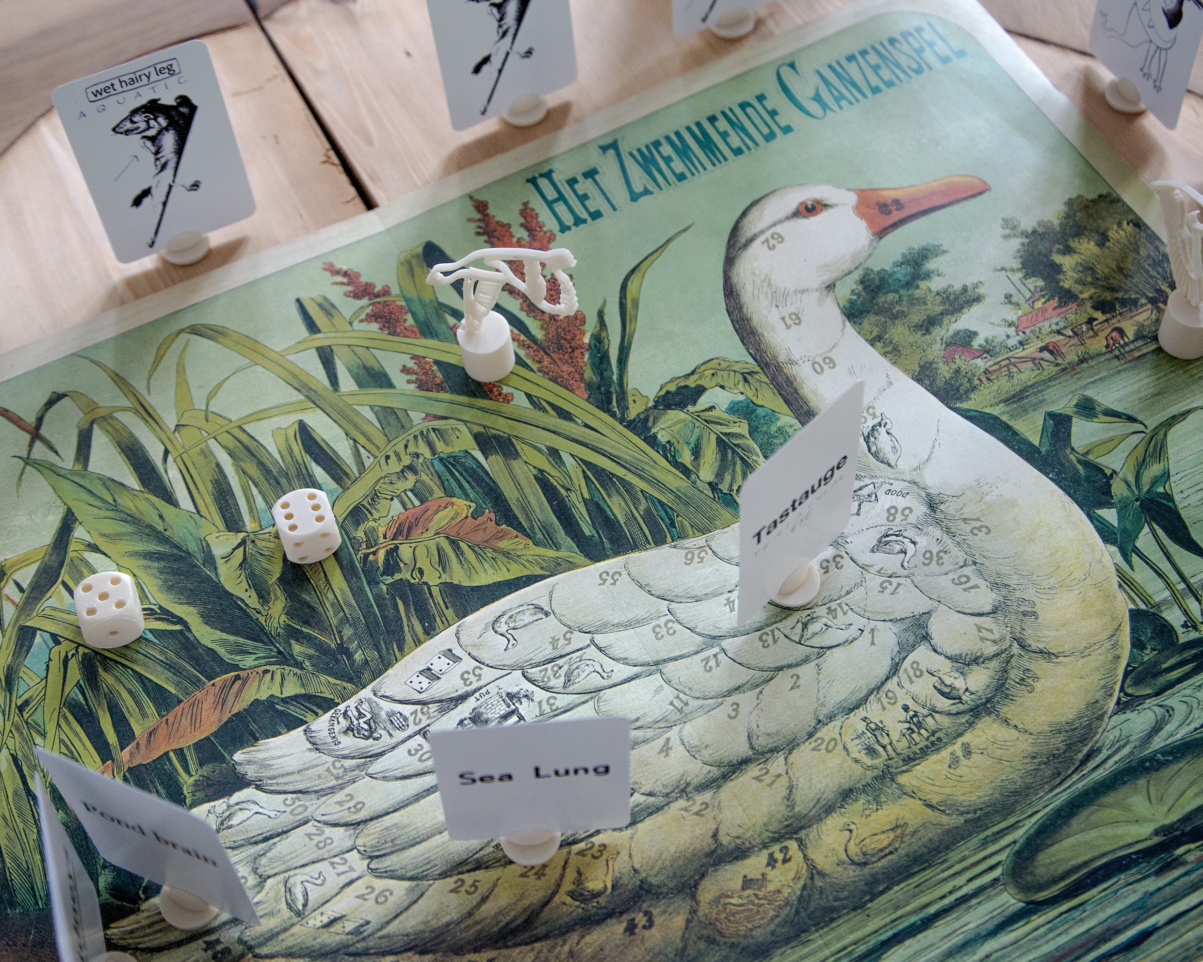 The work unfolds through an open-ended adaptation of the “Goose Game,” a 16th century board game originally from Italy, using its cyclical structure as a playful journey through the evolving meanings and layered histories of Western understandings of wetlands.