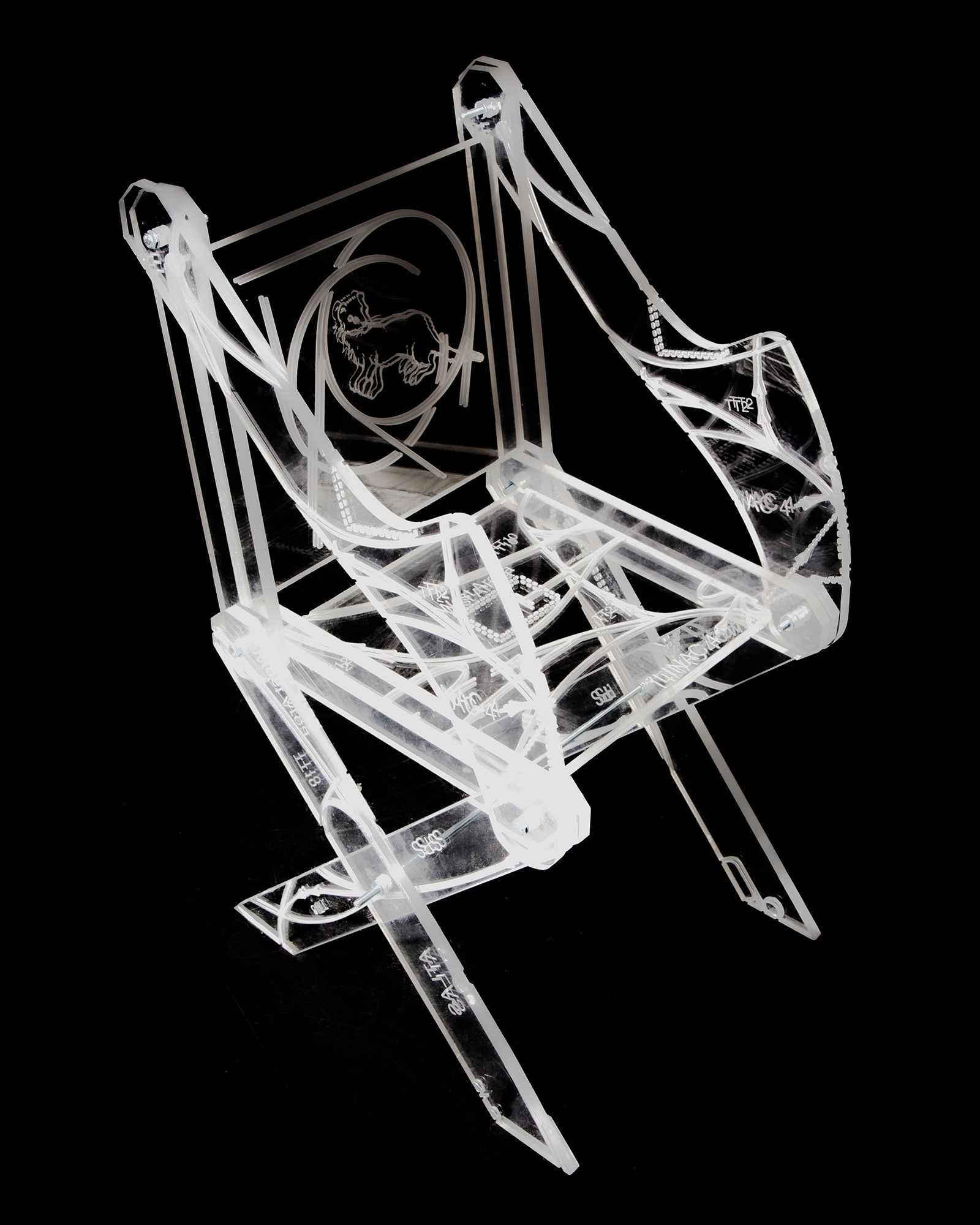 The chair, modeled on the medieval Glastonbury Chair—also called the ‘Petrarca chair’ or sedia pieghevole—is deliberately crafted to appear foldable, caught between stability and precariousness. Its surface bears an engraved map of CERN’s accelerator complex, a dense lattice of scientific, political, and conspiratorial forces. The map transcends its informative role, becoming a deliberate ornament that traces the hidden architectures driving disruption and uncertainty.