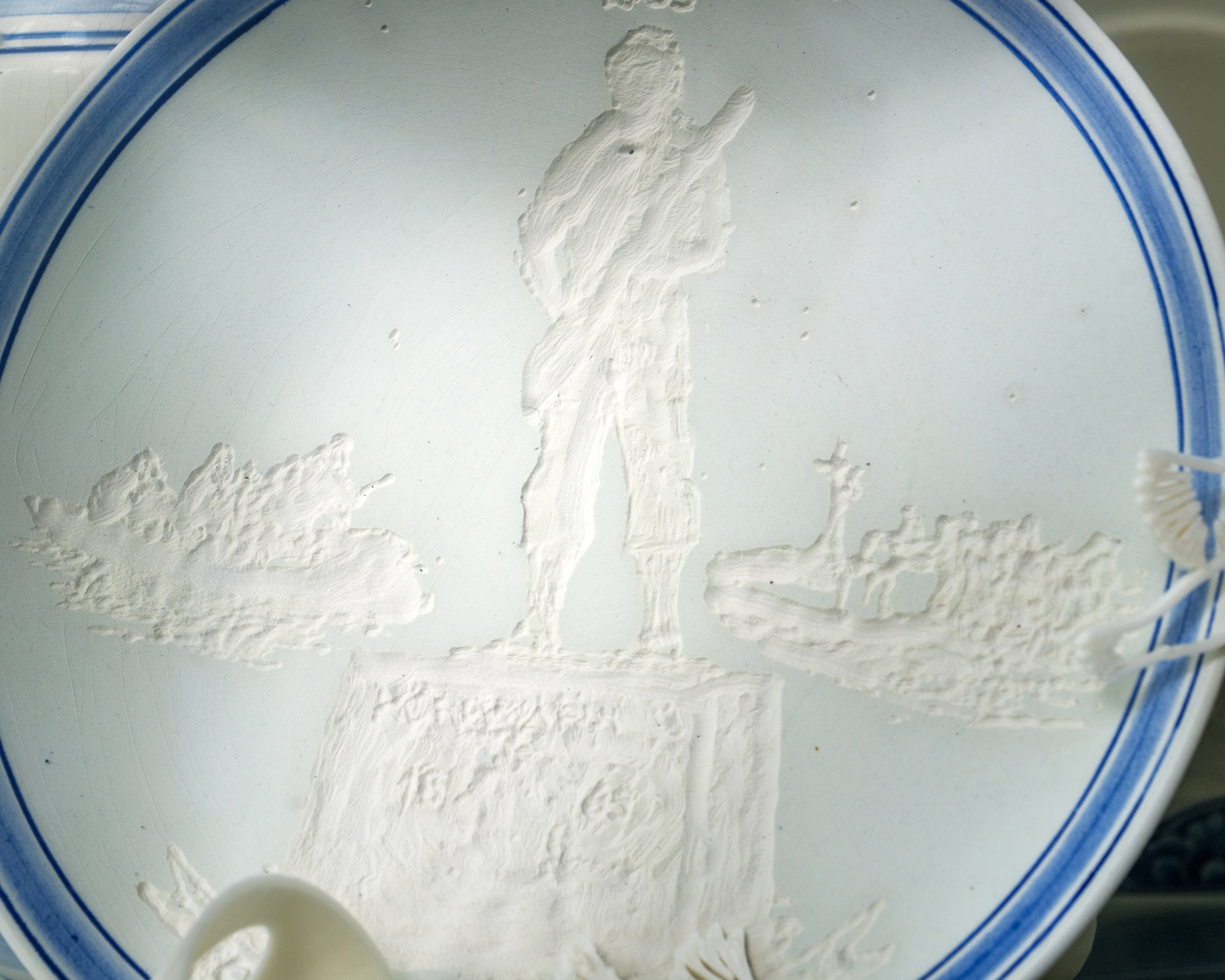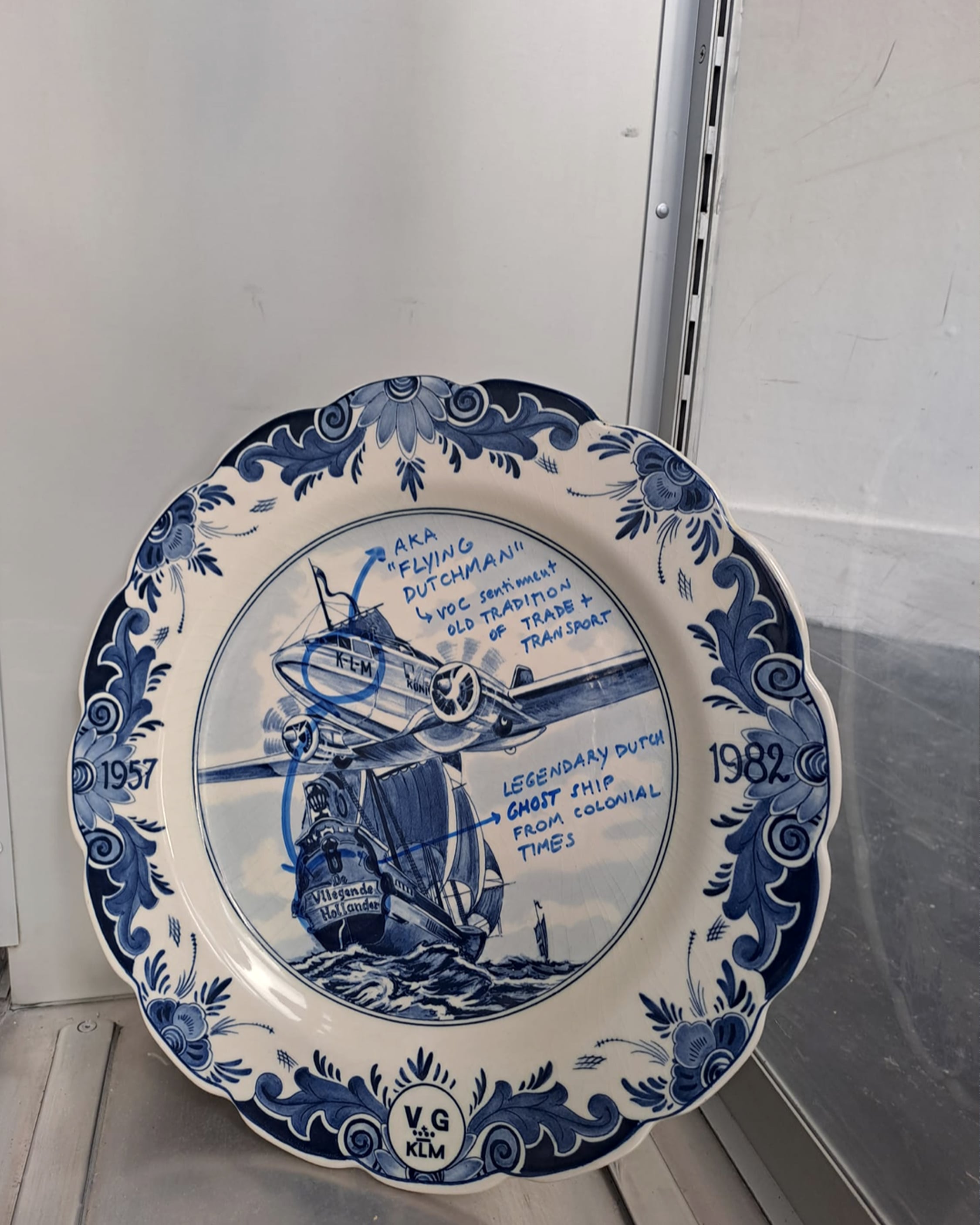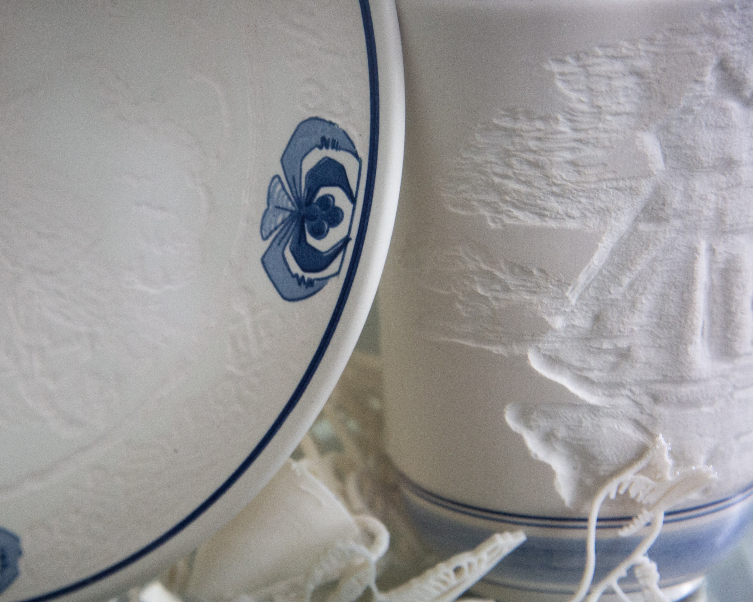 On a material level, a process of decay and transformation is triggered by scratching the sealed surfaces of traditional Delft Blue ceramics, which depict images of extractive colonial dominion over the environment. On top of this, the ephemerality of the materials used, such as 3D-printed bioplastic, degradable in marine environments, and water-soluble blue ink, reflects the instability and transience of both this research and the environments being considered.